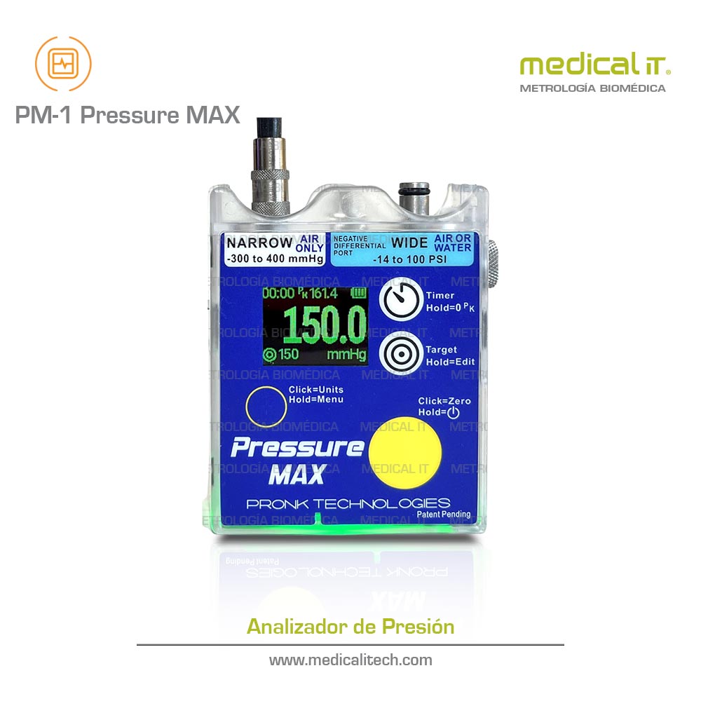 Medición de presión diferencial, presión en rango alto (-300 a 400 mmHg), presión en rango bajo (-14 a 100 psi), indicador de presión pico y cronómetro para pruebas de fugas/inflación.